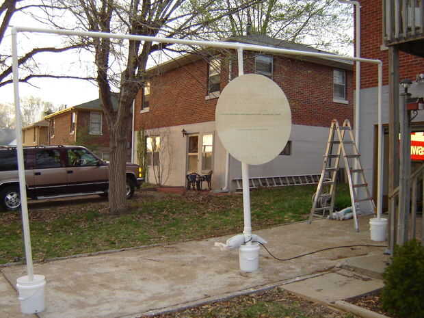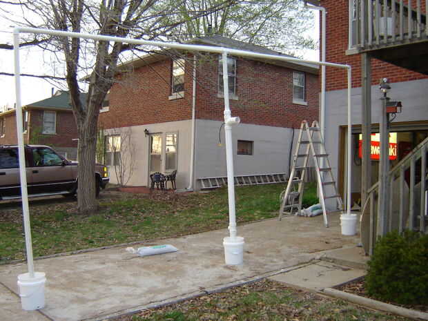 El bastidor fue construido utilizando tres soportes verticales que se unieron en la parte superior. Las dos escaleras exteriores eran sólo PVC tubería de 2" situado en el # 50 de hormigón en baldes galón 5. Un codo en la parte superior de cada tubo permitió un apoyo cruzado para conectarse.