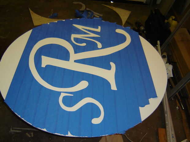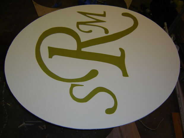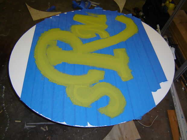 Arena y me puso unas cuantas capas de pintura blanca sobre el círculo. Una vez fue seco y teniendo en cuenta donde se encontraba mi agujero del tornillo de lag, enmascara una sección grande del círculo y aplicar mis cartas ahora ampliada. Usé una navaja para cortar y quitar el masking de las letras. Tomaron una muestra de la tela que se utilizaría para el telón de fondo y el color personalizado de tienda de pintura coincida con alguna pintura. Unas capas de pintura sobre las letras enmascaradas y luego se retira el masking. Había pocos lugares donde la pintura consiguió bajo el enmascaramiento, así que regresó y tocó alrededor de las Letras con pintura blanca.