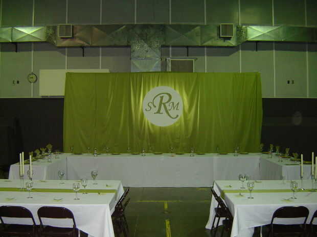 La tela usada para el telón de fondo era sólo un paño de algodón que estaba cercano en el color de los vestidos de las damas de honor. La tela se vendió en 50" o 52" ancho y yo compramos 30 yardas de él (gracias a Dios por el 50% de descuento cupones). Hay seis paneles colgando verticalmente esa superposición que cubren el marco. En los extremos, me envuelve a la tela alrededor de la parte trasera y cubrió para ocultar la tubería.