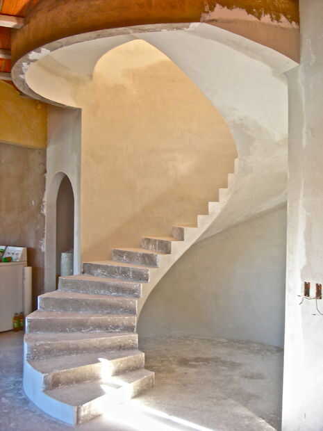 Porque los pasos funcionaron a 360 grados, el aterrizaje tuvo que apoyar la escalera y el piso de arriba. Formamos una circular 1/2beam en el piso y levantar hasta verter la viga circular completa.