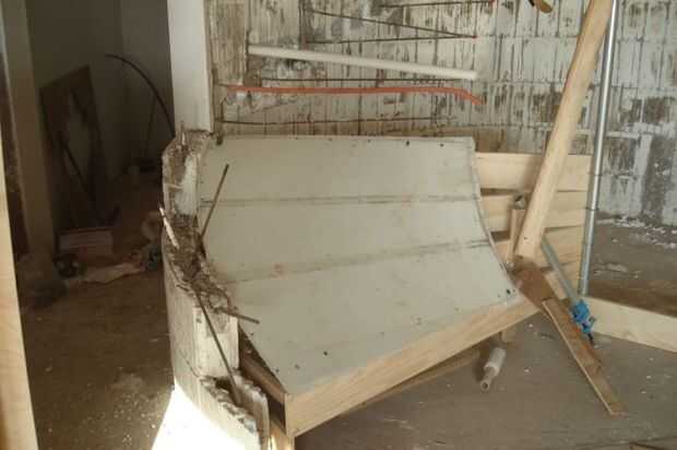 Usé un perno de u de 2" sujetado por el extremo del tablero de madera contrachapada ancha de 6" para asegurarse de que la pared era redonda.