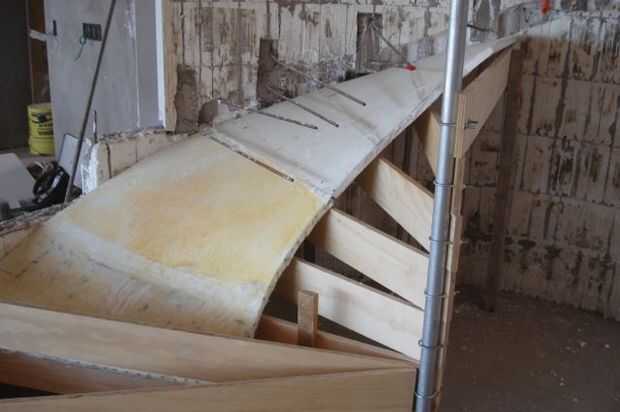 El mismo tableros apilados y girar para formar la parte inferior apoyan para una forma de espuma y fibra de vidrio que realizamos mediante la deformación 1" beadboard a la necesaria forma alabeada, luego fiberglassing. Hizo dos secciones, cristal de ambos lados con resina de epoxy.