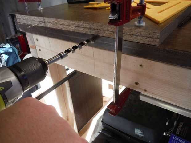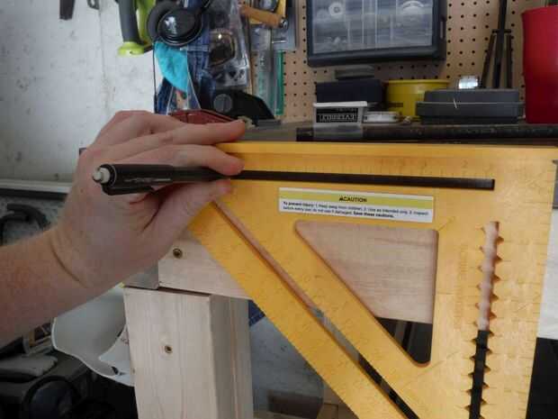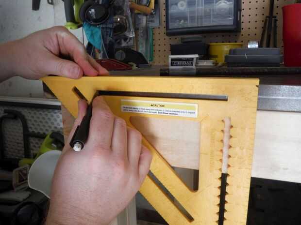 4. Taladre agujeros guía en las intersecciones de las líneas asegurando que están en ángulos de 90 grados al Banco y al estante.