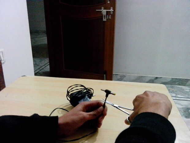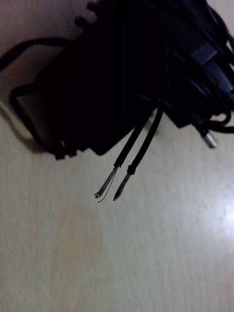 Tome el adaptador, cortar su cable con la tijera y luego retire el cable de los extremos.
