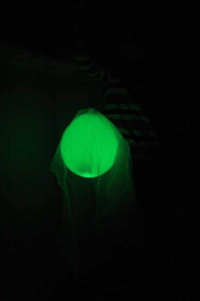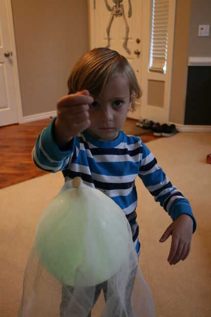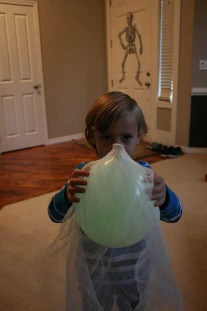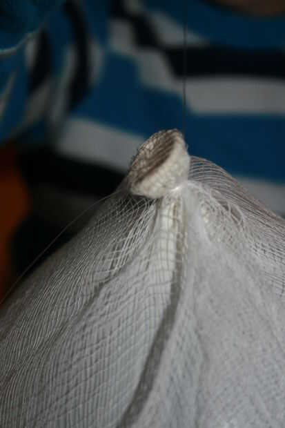 Con el nudo de globo apuntando arriba, cuelgue el balón de un pedazo de estopilla y su ayudante sostenerlo.