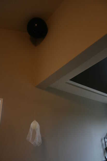 Tire un poco plomo apagado el carrete de pesca de línea (no cortar todavía!) y atar a uno de los globos negros. Una vez que se asegura, cortar los pesos y empezar a dejar hacia fuera de la línea de pesca por lo que el globo se eleva a unos 15 pies en el aire. Si tu primer espíritu está demasiado cerca de ella, cuando la gente mira para arriba, son más aptos para ver el negro del globo y estropear el misterio. Si es realmente demasiado cerca, podría incluso iluminar un poco el globo negro, así que date a buena parte de la habitación.