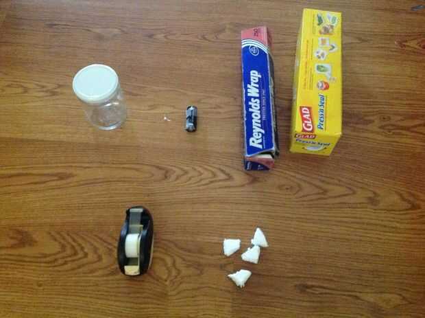 Necesita unos materiales para hacer este proyecto. 1 botella pequeña de plástico transparente con la tapa 1 LED 1 batería de una linterna antigua Papel de aluminio Press-n-Seal alegres abrigo (u opaco se aferran - Wrap) Cinta Espuma de poliestireno