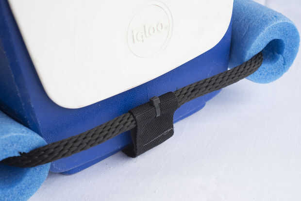 Centro de la correa que va la a lo largo de la parte más larga de la nevera y poner un zip empate a través de la correa y alrededor de la cuerda. Esto evitará que la correa mueva a los lados de la nevera.