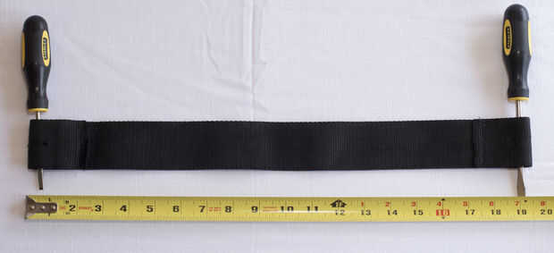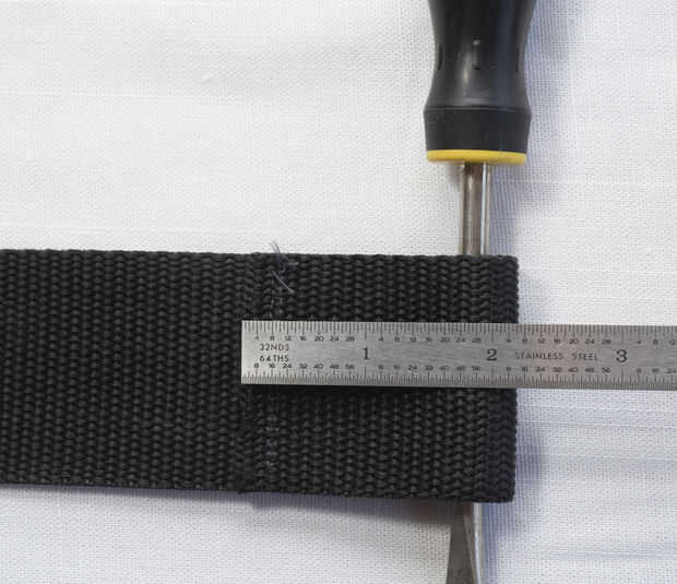 Tomar la menor 24" correa y carpeta sobre 2" haciendo un bucle y coser el extremo de la correa. Lo mismo para el otro extremo. La longitud total debe estar entre 19" y 20". Los destornilladores son para mostrar los lazos en los extremos de la correa y la correa de balanceo para arriba.