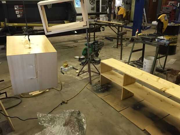 Después de lijar todo, colgué los estantes superiores del techo para poder manchar la parte superior, inferior y lateral sin tener que moverlos.