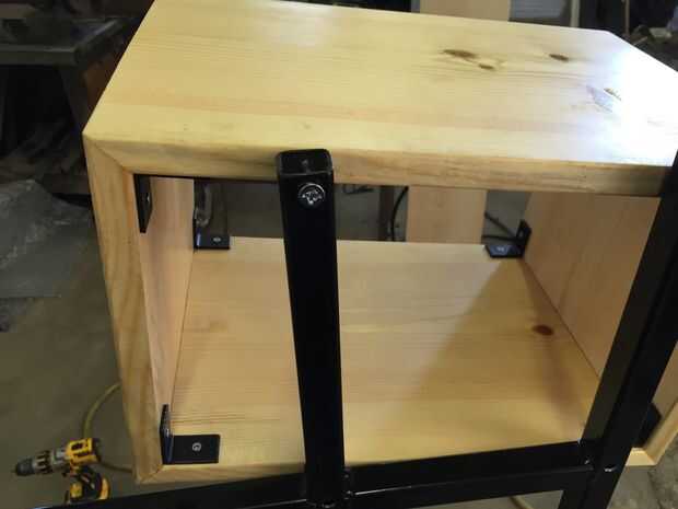 Alinee el marco del metal a su posición apropiada en el estante inferior de madera, marca donde taladrar los orificios en el estante inferior de madera, retire el marco de metal y pre-taladro en la madera en los puntos marcados (donde se va los tornillos de 4") con una 1/8 broca (para evitar que la madera se agriete al atornillar los tornillos largos). Montar la estructura metálica en el estante inferior de madera con 12 tornillos.