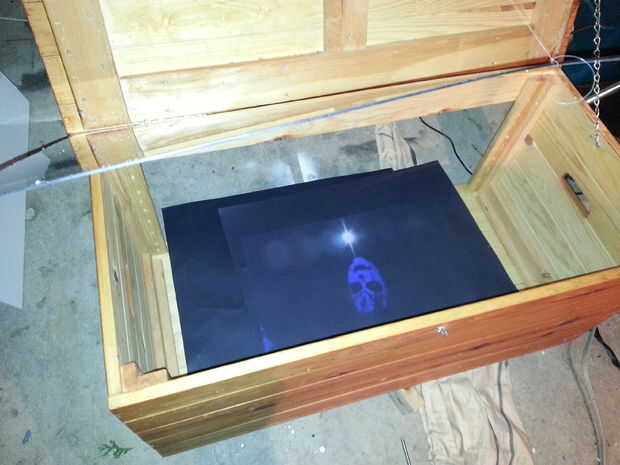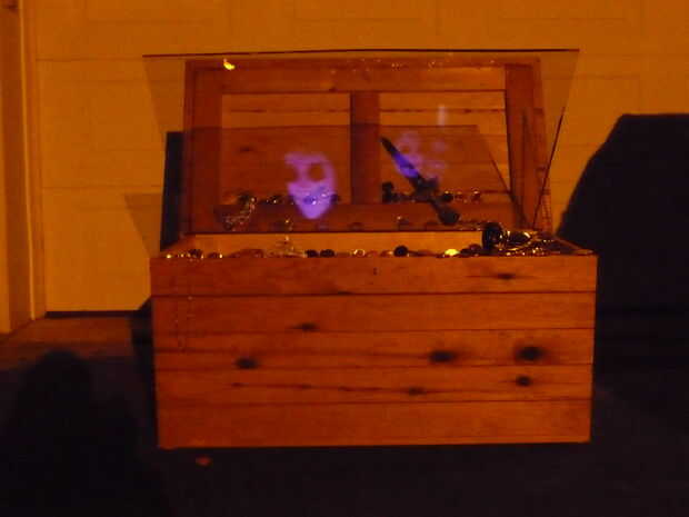 Esta es la configuración final para Halloween, voy a intentar conseguir mejor calidad de vídeo en la gran noche. La plataforma es bastante autoexplicativo, ver las fotos con las notas o volver un paso para la explicación de cómo funciona. Sería más fácil usar un monitor grande o una pequeña TV en la parte inferior del tronco. También puede crear un tronco a la suite de la pantalla. Conseguir algunos detalles detrás de la imagen reflejada debe ayudar a que la ilusión "holográfica" (velas, espada, corona, monedas). Es difícil para mí estar impresionado con el resultado, porque no hay ningún misterio acerca de cómo funciona; pero la gente que he demostrado que es convenientemente impresionada. Si crea a unos fantasmas de su propio, déjeme por favor saber cómo le fue. Inquietantes feliz!!!!!!