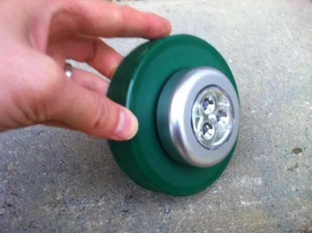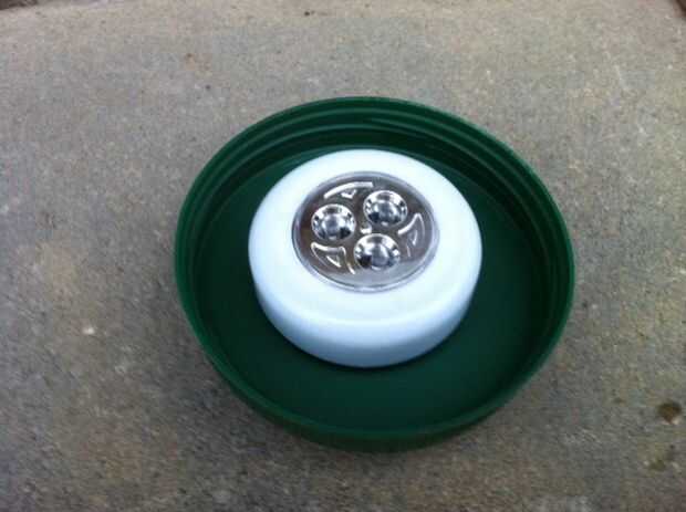El LED puck luces tienen cinta auta-adhesivo de montaje.  Despegue el revestimiento de la cinta y pegue una luz en la parte superior (exterior) de la tapa de la jarra.  Esta luz encenderá el "cuerpo" del espíritu.  Coloque la otra luz dentro de la tapa (no tienes que palillo éste) y el tornillo de la tapa en la jarra.  Esta luz iluminará la cabeza del fantasma.  Tuve 4 bombillas más brillantes de ensamblándolos que usé en la cabeza, y tenía 4 los dimmer que utilizaba para iluminar los cuerpos.