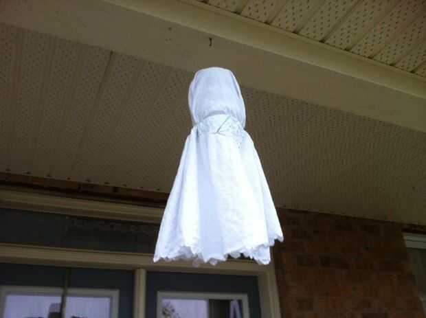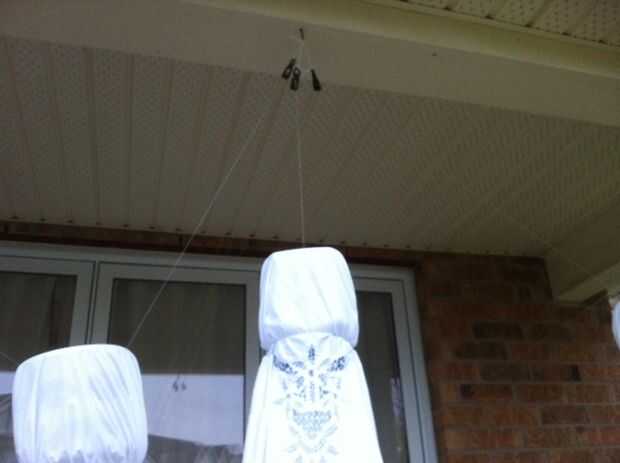 En mi caso he utilizado el mecanismo de la bicicleta, por lo que las líneas de pesca pasan a través de las poleas en la parte superior de mi porche (ver segunda foto para más detalle). Pasaba las líneas de pesca a través de una ventana abierta en el frente de mi casa, el mecanismo de la bicicleta dentro. Las líneas tienen suficiente holgura que puedo cerrar la ventana cuando no esté en funcionamiento. Cada pedal de la bicicleta tiene dos líneas de conexión, uno va directamente por la ventana y uno yendo primero a través de una polea en la base de la bicicleta (ver fotos en mi anterior instructable. Tenga en cuenta que en el anterior instructable, tenía cuatro palancas montadas frente a la bicicleta, este vez que omite las palancas y funcionó que las cuerdas directamente hacia fuera la ventana, guiada a través de escarpias en la parte delantera del soporte bicicleta.) Os adjunto las dos líneas de un fantasma a un pedal (una directamente, uno a través de la polea) y las dos líneas de otro fantasma el otro pedal. Un tercer fantasma (un medio) fue conectado con una sola línea a uno de los pedales. También tuve un fantasma pequeño cuarto solo colgando de una sola línea sobre las cabezas de la temporada, no conectado a la bicicleta.