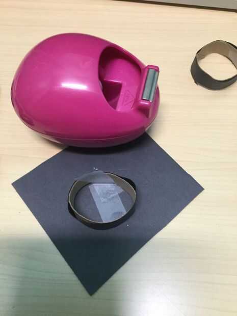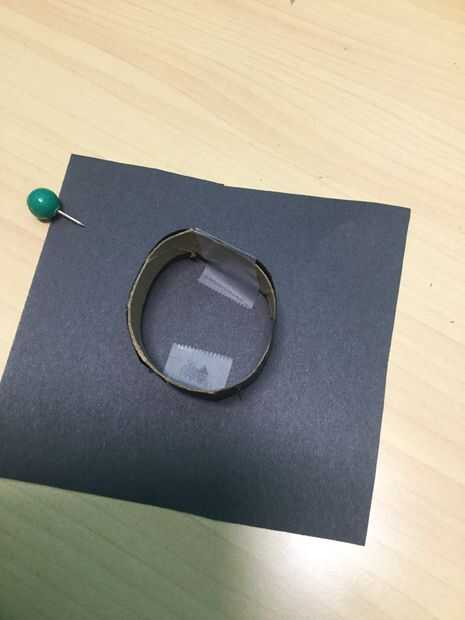 Con dos pequeñas tiras de cinta, cinta cada anillo en el papel. Probé usando el pegamento en un principio, sin embargo, los anillos eran demasiado delgados que se adhieren. Entonces usando una virada (funciona mejor, a diferencia de los lápices que rip y pliegue el papel), hágale un agujero en el centro de cada sombrero. Esto es donde irá el cable.
