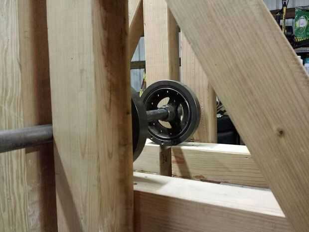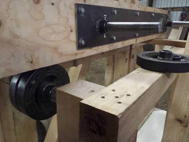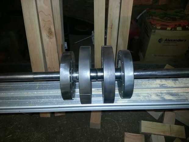 Ejes y ejes: Utilizar pequeños segmentos de tubos de acero y agujeros en ellos para hacer casquillos perforados. Utilizamos éstos para mantener la barra de peso en su lugar, con pequeñas placas soldadas a ellos para evitar que la barra de peso deslizante hacia adelante y hacia atrás. Las ruedas se fijaron de manera similar, y grasa de eje se utiliza para lubricar las ruedas. El eje de la rueda en el brazo era tachuela soldada en su lugar, para que el árbol permanece estacionario con respecto al brazo, y sólo las ruedas girar.