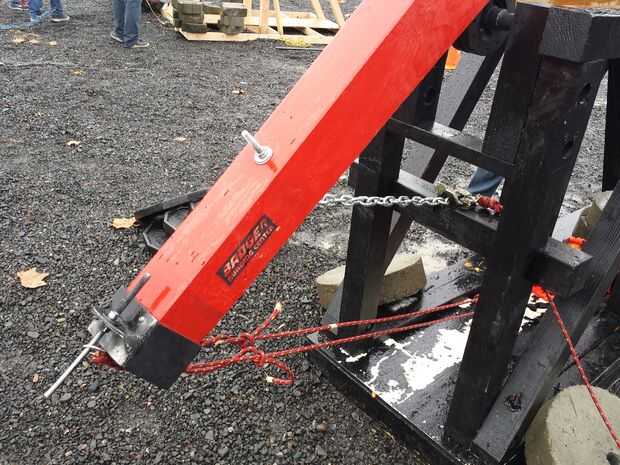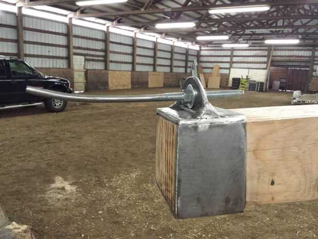 En la punta del brazo, soldó con autógena una caja de acero alrededor de él para sostener el perno para el lanzamiento de la Honda y un lazo para atar el otro extremo de la cuerda de la eslinga para. Esto se puede hacer otras formas, pero nuestro método parece genial.