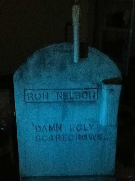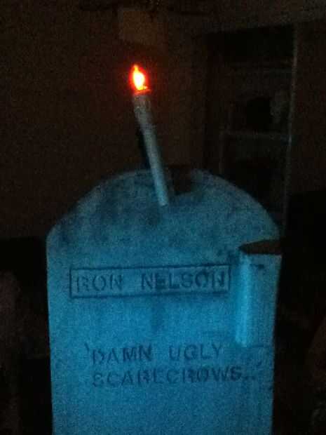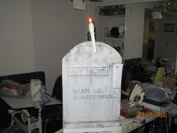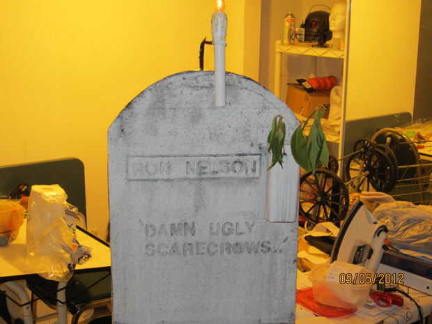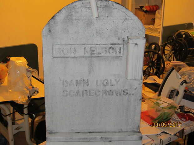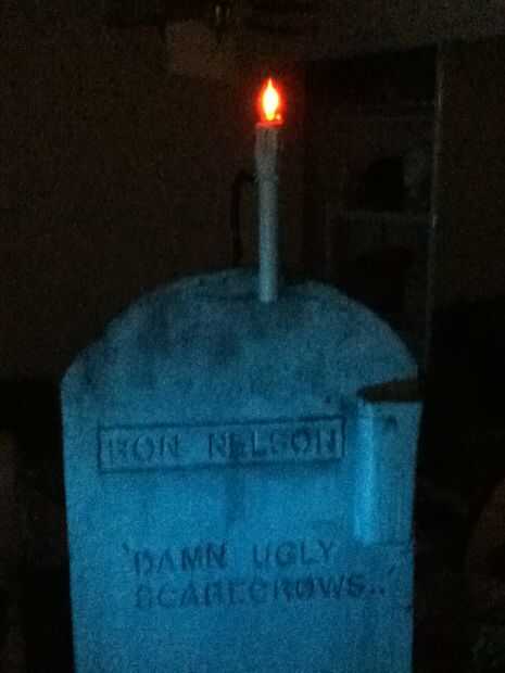 he creado esta lápida en homenaje a un miembro caído en Museo de los Ángeles viven vapores Railroading. Primera historia un poco. Hay estos espantapájaros aspecto tonto que se pueden obtener en Joann que odiaba con pasión. Mantuvo subiendo con interesantes formas de deshacerse de ellos. Bueno, creé este T-piedra con su nombre y uno de sus favoritos murmullos. Es una forma básica piedra sepulcral con un cartón de respaldo junto con un motor de una de esas pantallas de flor de fibra óptica cheapy. Utilicé un alambre de percha metal desplegada para un tramo de tubería de PVC con una bombilla de parpadeo. Añadí un florero y pintado para parecer espeluznante. El motor se mueve realmente lento y parece maravilloso.