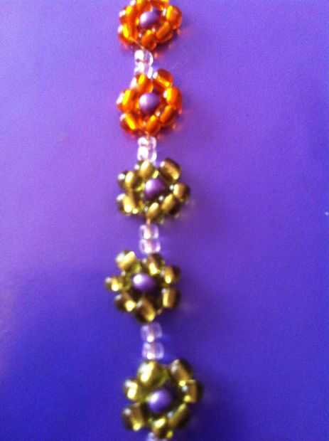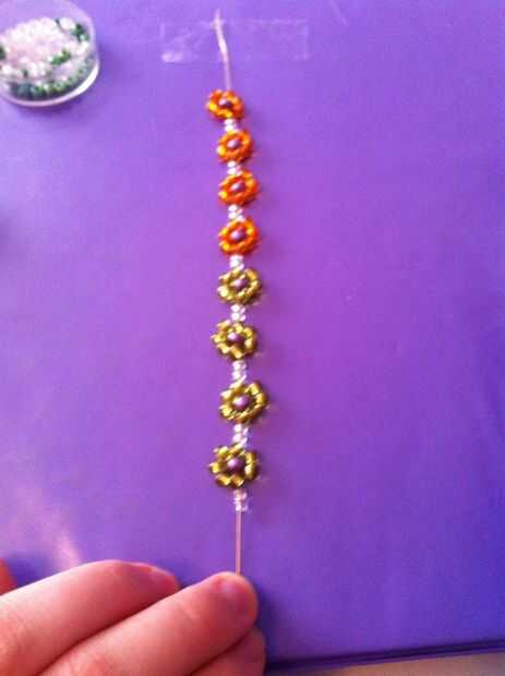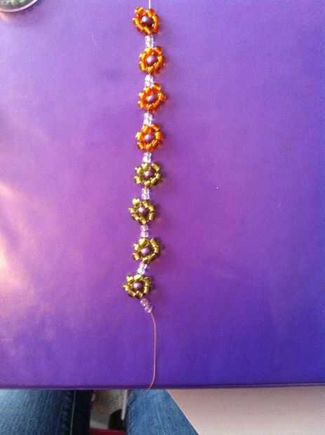 Vergonzosamente, corrí fuera granos de naranja como me fui a lo largo. En lugar de empezar de nuevo, sólo decidió utilizar un color diferente para mis granos de pétalo. Te recomiendo hacer un patrón o continuar con los mismos colores, pero da la pulsera una mirada única.