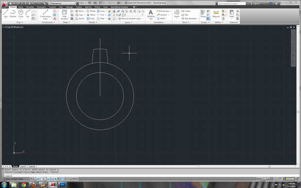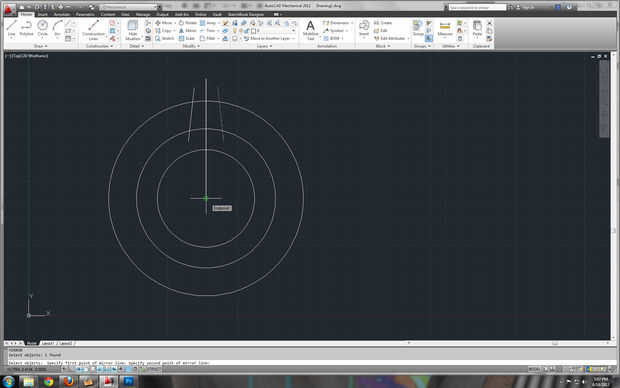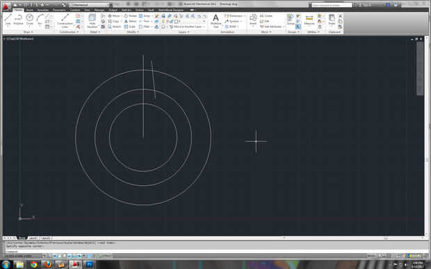 Siguiendo el orden de la línea, un solo click para iniciar la línea y un segundo click para determinar el punto final. [2] en la imagen, verá algunas cosas vale la pena mencionar. La verde línea de trazos indica que la línea es perpendicular, la ventana resaltada indica la longitud de la línea, y la otra caja de diálogo muestra el ángulo exacto (presionando < tab > se moverá entre los cuadros de diálogo). Por ahora la longitud de la línea es arbitraria, pero me aseguré de que la parte superior era suficientemente lejos de otras partes de mi dibujo tal que no entran en conflicto los puntos de presión. Una línea es una acción muy común, por lo que el software y lo mantiene en el comando para dibujar líneas múltiples.