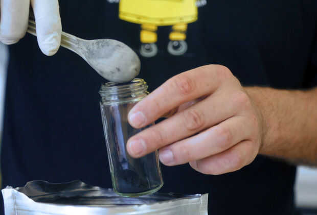 Añadir una cucharada pequeña de polvo de óxido de hierro a un recipiente de vidrio limpio y seco. No necesita mucho, sobre una media cucharada para un envase de 6oz (175ml).