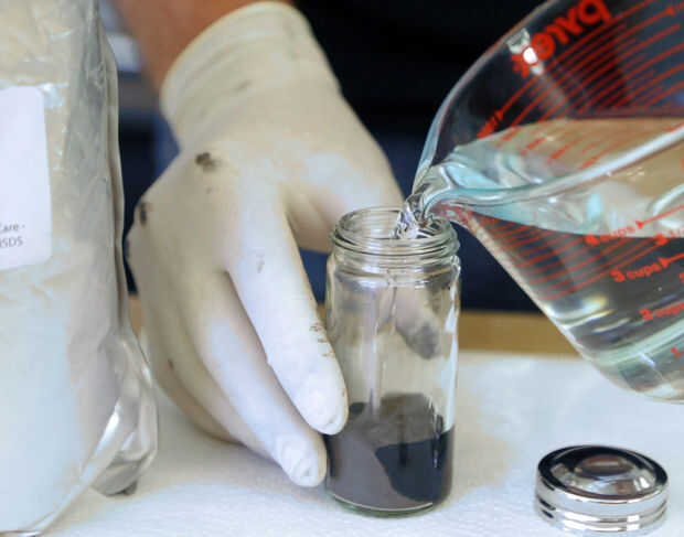 Llene el resto del recipiente hasta el borde con agua. No te preocupes sobre cualquier bolsillos secos del polvo después de que el agua se vierte en la parte superior, el polvo de óxido será eventualmente ser saturado con agua.
