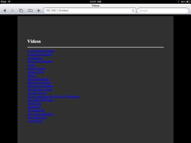 http://192.168.1.3/video (o cualquiera que sea la dirección ip de su servidor) y, si funciona, debería ver una lista de todas tus peliculas. Haga clic en una película, y usted debería ver un rectángulo negro. Puede tomar un tiempo, pero debe aparecer un icono de play y podrás ver tus vídeos H.264 en su iPad/iPhone.