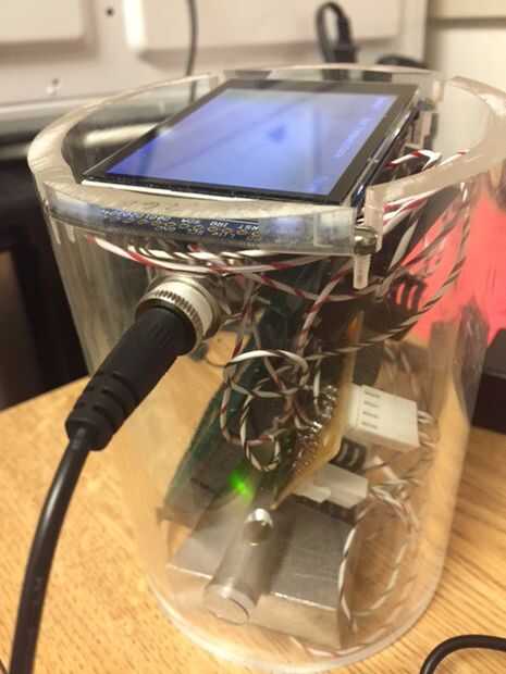 Para la base de la lámpara, utilizamos una pieza de 4" tubo acrílico que teníamos en la mano. Se utilizó un molino para perforar los agujeros para fijar la pantalla táctil, así como el agujero para insertar a la clavija de corriente. Una vez que la parte inferior de la caja hecho puede insertar el gato y el revestimiento para soldar los cables del enchufe del Arduino.
