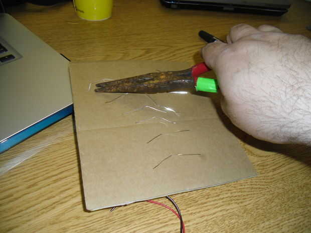 este proyecto consolida el trabajo con el sonido para activar el alambre utilizando un Arduino Mini Pro 3.3V con un circuito basado en parte en 'Programable LilyPad-alambre vestido.' de quasiben Un resultado similar puede obtenerse utilizando uno de