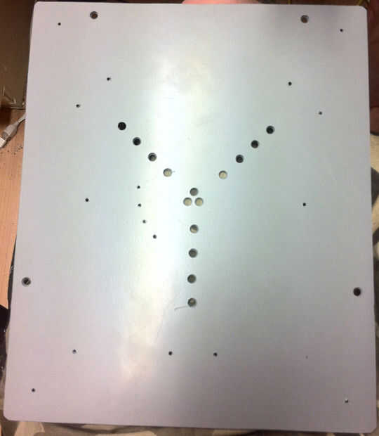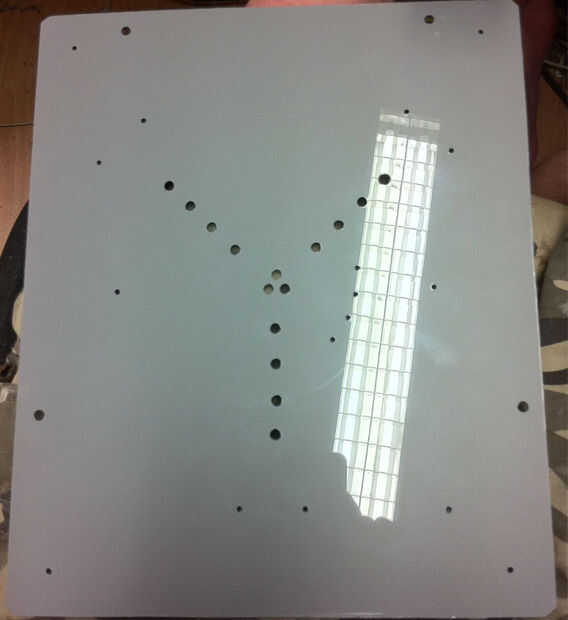 Corté una pieza de plástico gris, 3mm de espesor, y desde el centro trabajé donde irían los relés y los espaciamientos de luz y posiciones, marcadas con un marcador sharpie en la capa de la película.