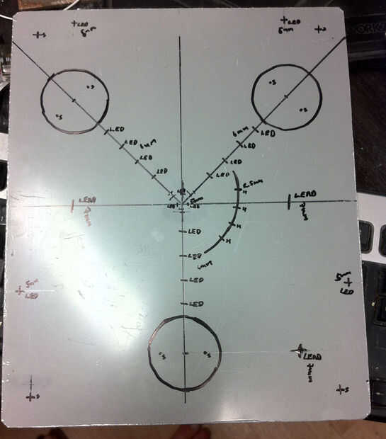 para las posiciones de LED que taladré un agujero de 5mm a través y luego utilice el taladro con mucho cuidado perforé un fregadero de contador de 6mm en la parte inferior, tenga cuidado aquí es fácil ir a través de si el pedacito de taladro agarra el trabajo pieza. el LED debe encajar lo suficientemente bien para mantenerlos mismos en.