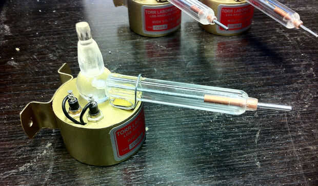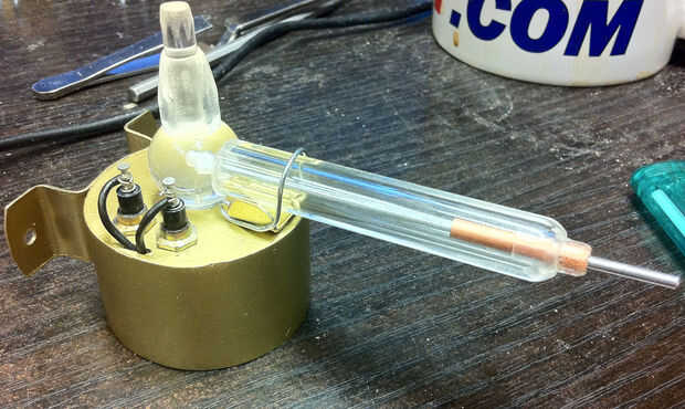 En las bases bajo el vidrio tubo es una placa con redondeado los bordes dado vuelta eso es el tubo de vidrio se encuentra en y un cable que va en la parte superior, utiliza el cobre para hacer la placa y algún alambre jardín tenía puesta alrededor de la curva y la forma en la parte superior y rodeado de las placas y super pegados a los tubos de vidrio falso en lugar.