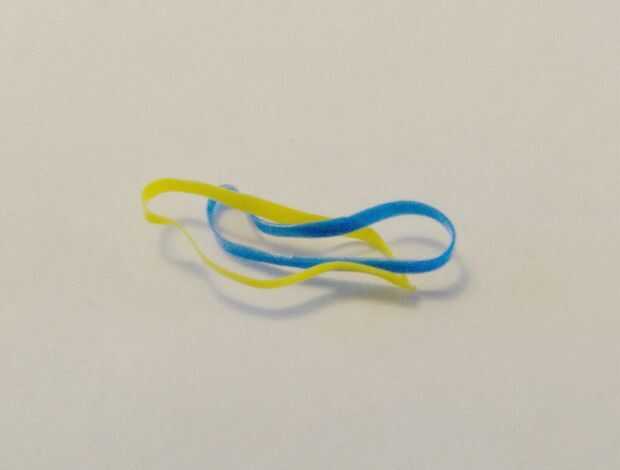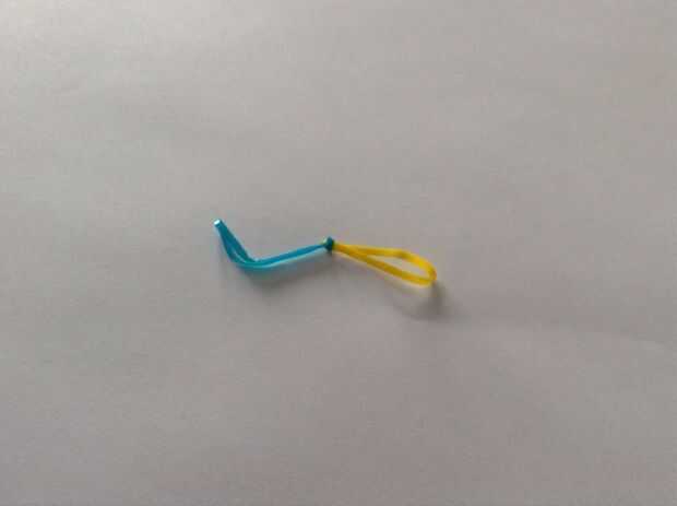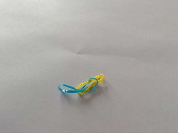 Primero debes unir las bandas de goma. Para ello pase uno a través de los otros one(first picture), luego tire un extremo por lo que parece la segunda foto. Entonces sólo tire firmemente.