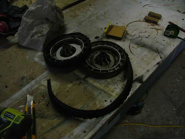 En lugar de comprar nuevas llantas (o terror un nuevo cortacésped) decidí retroceder las ruedas. Un vistazo rápido alrededor de Kmart local mostró neumáticos BMX a $5 cada uno. Profundidad de pisada un montón de ellos y un neumático lo suficientemente grande como para dar la vuelta a ambas ruedas.