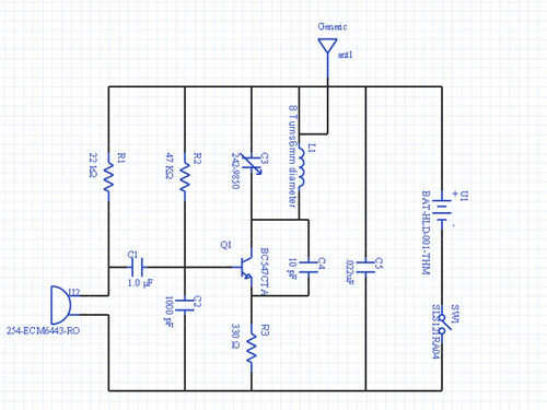 Como se puede ver en el esquema a continuación este es un circuito muy sencillo y será un fácil construir. En lo que el esquema no transmitir muy bien es donde la antena necesita ser colocado. Para obtener mejores resultados tendrá la antena soldada a la primer vuelta en L1. La antena debe ser aproximadamente 2 pulgadas de largo