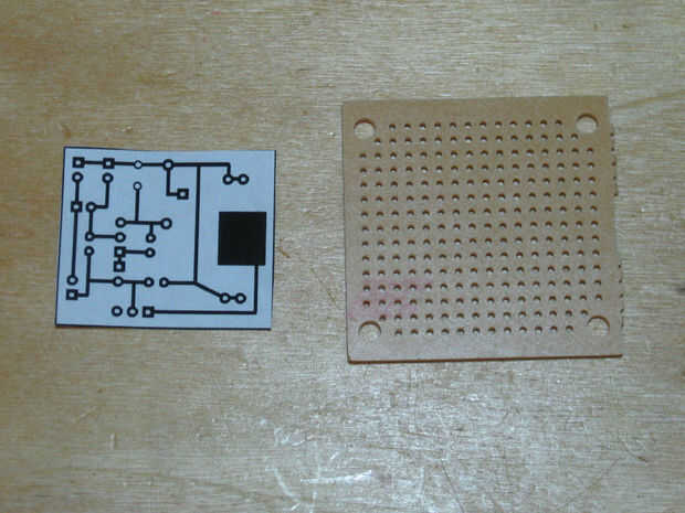 Si tu va el tablero de clavija de ruta entonces imprimir el archivo PDF y cortado a la medida. Superposición sobre el tablero de clavija y manténgalo a la luz para conseguir los agujeros componentes alineados con la cuadrícula del tablero de clavija. Entonces el diseño en lugar de cinta. Asegúrese de que la rejilla de cobre está en la parte inferior de la Junta de peg y el diseño se graba en la parte superior. Seguir adelante y tomar un objeto puntiagudo como el conductor de una de las partes y meter todos los orificios del componente.