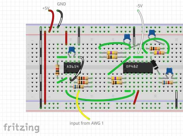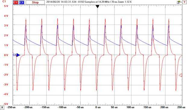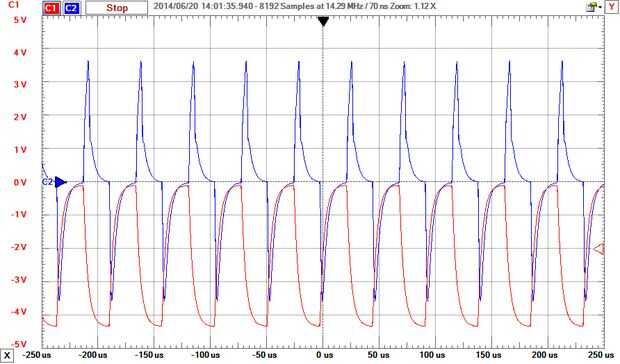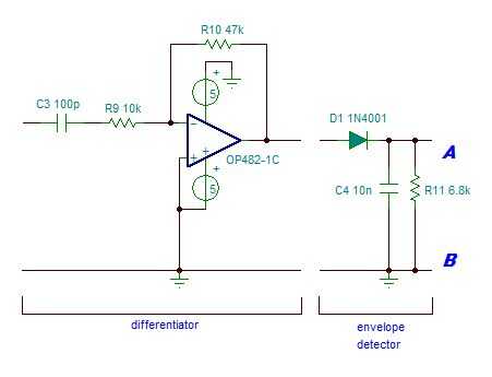 La teoría detrás de la mayoría de estas piezas es un poco mucho para llegar aquí. Una vez más, si deseas el diferenciador (nota que éste está activo por el op-amp) y las explicaciones del detector de envolvente . En definitiva, el diferenciador, créanlo o no, distingue la señal (piensa en cálculo y sentido total). Como la señal de entrada se levanta o cae rápidamente (alta frecuencia), la amplitud de salida aumenta. Como la entrada se levanta o cae lentamente (baja frecuencia), la amplitud de salida disminuye más cercano a 0. Esto tiene el efecto interesante de convertir la señal de FM en una señal de AM. Ver el alcance o Mostrar en la imagen 2 para una comparación (alcance CH 1 al pin 14 del OP482 y CH 2 al pin 8).