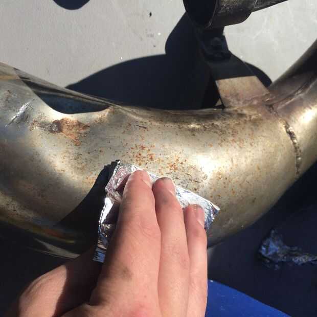 Primero puede conseguir papel de aluminio y dobla hasta pequeñas, añade muy poca agua y empezar a fregar. Mantener limpieza hasta observa la tubería empieza a brillar. Después de unos 20-40 golpes duro, limpie la izquierda cosas de suciedad y polvo de hoja de la tubería para revelar el brillo nuevo!!