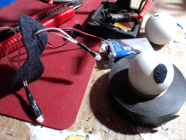 Hacer agujeros en la parte posterior de las pelotas de ping pong. Un poquito de relleno de fibra para ayudar a difundir la luz de la materia. También rascado el caso plástico del LED con papel de lija fino para difundir aún más la luz.