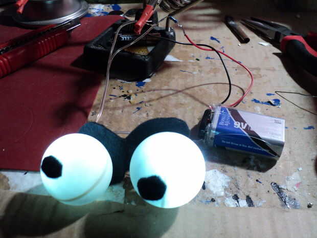 Conectar y soldar los LEDs en el lugar montado en la abertura del ojo de fieltro negro.