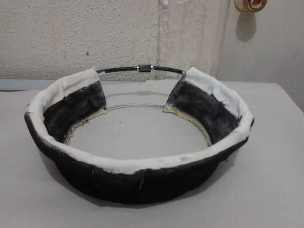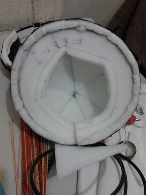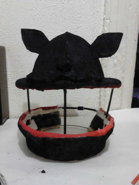 Para la parte superior de la cabeza utilicé uno de tapas de mi hijo como modelo y hace una forma básica de la cúpula. Lo pongo con la pistola encoladora una orejas de espuma adicional. Que utiliza el cable de alambre para hacer un anillo y unido a la cúpula con una tira de espuma que forma la mandíbula superior de la pesadilla. Entonces creé la quijada más baja con poco más de espuma, el anillo del metal de la pantalla y otro anillo de alambre de cable. Utiliza el arma de pegamento para poner todo junto y reforzó algunas de las uniones con piezas de una tela vieja (que era cinta super fuerte). Tienes que unir las piezas firmemente para que el pegamento realmente funciona. Para el hocico corte un ocho, como forma de espuma y pegados encima de las mandíbulas. Entonces, tomé una pequeña franja de espuma, rodado de ambos lados y que una nariz perfecta.