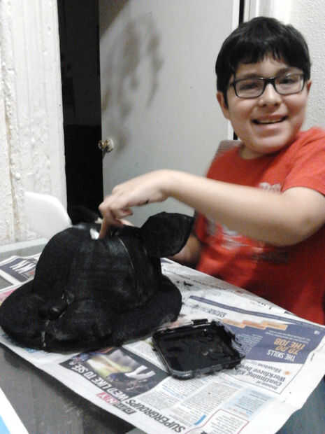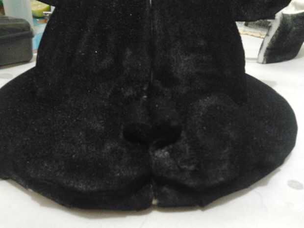 Mi hijo me ayudo con una primera capa de pintura negra y luego le puse la cabeza y mandíbulas con tres palillos. Primero había pegado en el interior de la mandíbula inferior y luego a la mandíbula superior. Usé un montón de pegamento caliente y reforzado con piezas de tela. Compruebe el diagrama con los patrones y medidas.