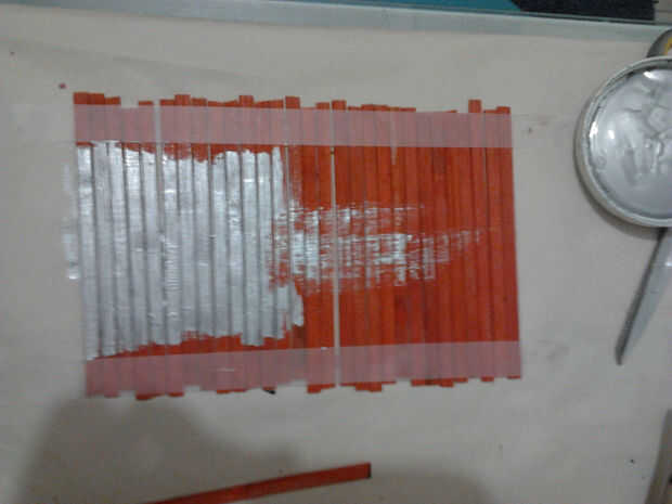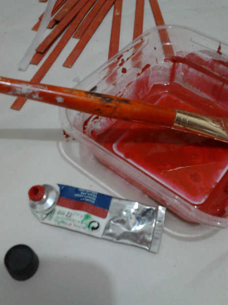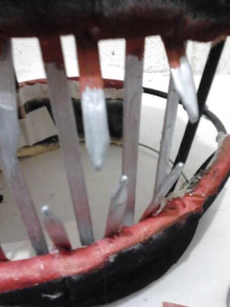 Para los dientes usé palillos de bambú de una vieja estera de tabla. Ya eran rojos, por lo que acaba de agregar algunos pintura metálica en el medio. Puesto que la pesadilla tiene dos filas de dientes primero pegué toda una línea de palos entre las dos mordazas. Añade gran apoyo! Luego cortar en la mitad del resto de los palos, utiliza las tijeras para hacerlos tipo de puntiagudos y había pegado delante de la primera línea de los dientes. Utiliza pintura acrílica negro por todas partes y agregó algo de sangre con las sobras de una vieja bañera de gouache rojo. Corté dos aros de espuma pequeña de un dardo nerf, pintado rojo y listo los ojos!