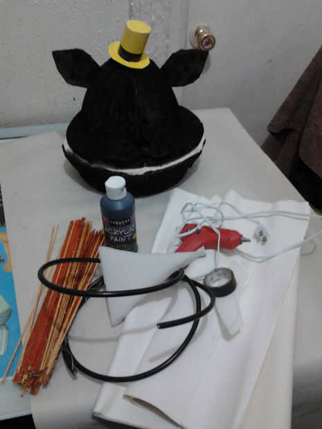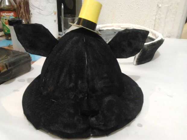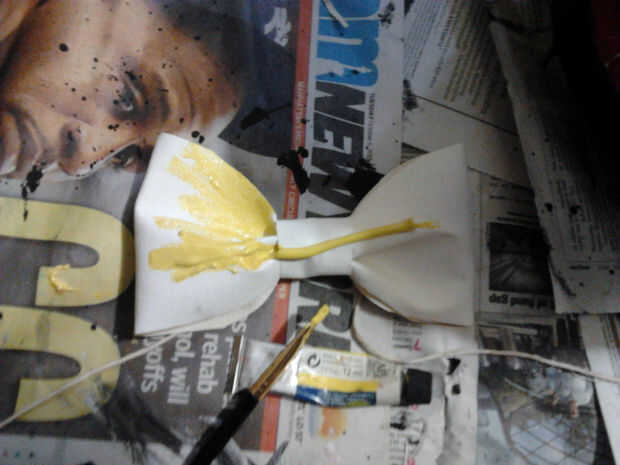 He hecho característico sombrero amarillo de la pesadilla con cartulina de un tubo de papel higiénico y una carpeta vieja. Usé pintura amarilla y un trozo de cinta eléctrica para la decoración. Hice la pajarita de otra pieza de lienzo había atado a un trozo de cuerda y había pintado con pintura acrílica más.