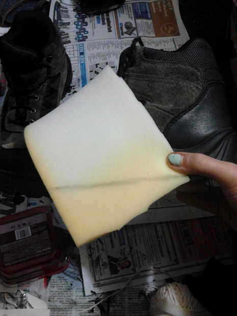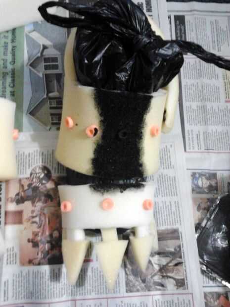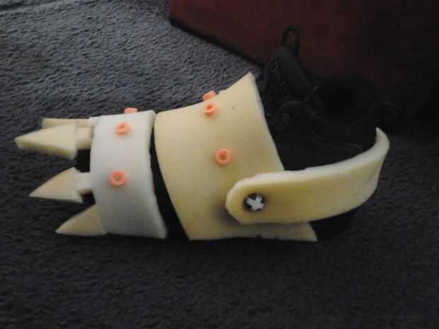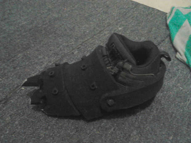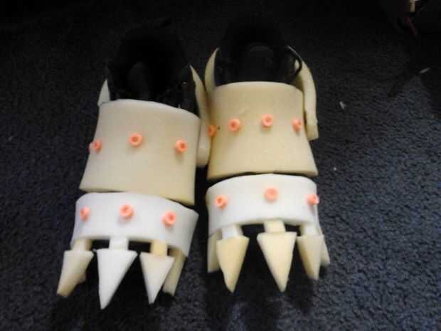 Así que nunca he visto pies de pesadilla, pero mi hijo me dijo son "regulares robóticos pies con garras." Derecho! Así que usé franjas de espuma para esculpir los pies de garra en la parte superior botas de mi hijo. Para cada pie, primero cortar dos elásticos de un calcetín viejo y pasa a través de la parte delantera de la bota. Entonces básicamente utilizó dos franjas de espuma (1 más pequeño que el otro, corte en forma de trapecios) y había pegado a las bandas de calcetín. Entonces añadí una raya más fina más de espuma para el talón. He añadido algunos acentos y algo así como un botón para pasar a través de la pieza del talón con lo que quedaba de la nerf dardos. Entonces todo lo pinté con acrílico negro (primero pongo en una bolsa de plástico en las botas) y pintura metalizada para las uñas (también cuidados de la misma manera como las de las garras). Pensaba yo que el nerf Acentos más buscado como aceitunas negras de tornillos o pernos, pero mi hijo totalmente aprobado: P