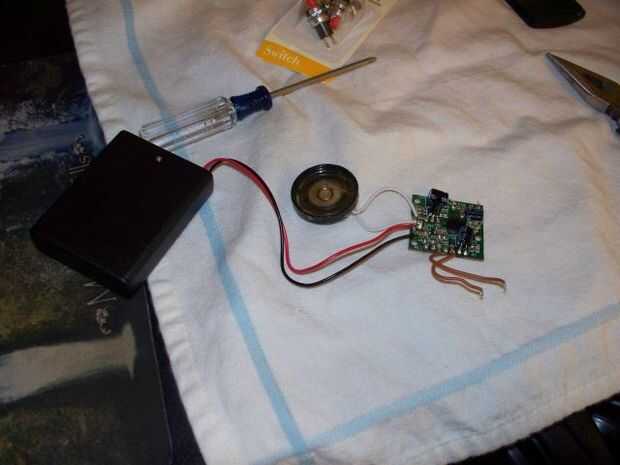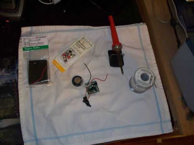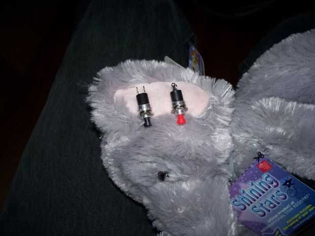 compré una batería 4-AAA para reemplazar las ranuras de la batería en el caso original de Sr. Voice. También recogí un conjunto de interruptores de botón que sería más fácil que pulsar cuando se monta en el exterior de un elefante de peluche. Esta fue la única soldadura que tenía que hacer para todo el proyecto, pero fue complicado por el hecho de que el orador comparte un terminal, de todas las cosas, el cable positivo de la batería. Decidí que si funcionaba, debo dejarlo solo.