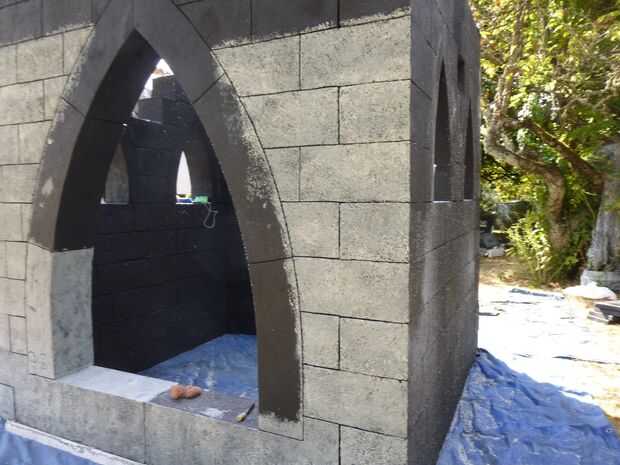 Después de que el mausoleo está montado empezamos con una capa base de pintura exterior negra mate, aplicada con un rociador de pintura a cada pieza expuesta de espuma. No utilice esterilización pintura como va a dañar la espuma.