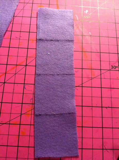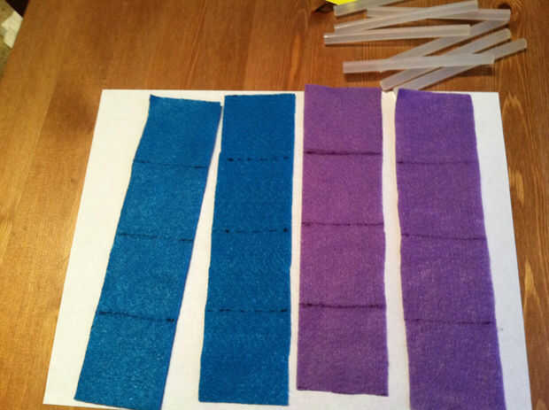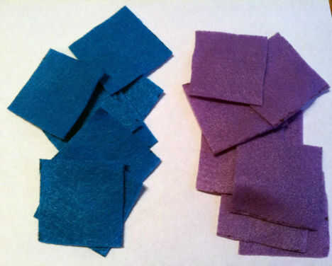 Pensé que 2 "x 2" plazas eran un buen tamaño para el agujero de diámetro de 2,75". Así que las dos piezas de fieltro y unas 2 pulgadas ancho tiras con ambos colores.