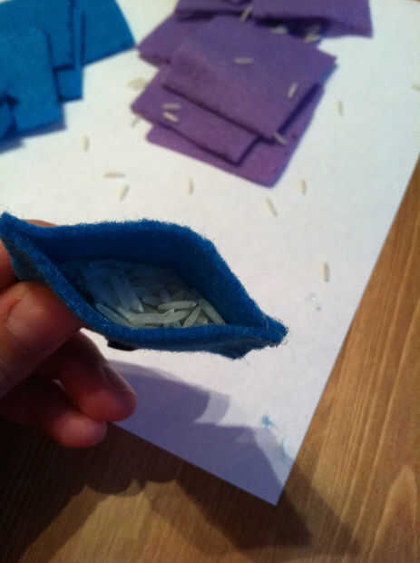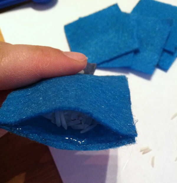 Luego tomar el bolsillo en una de las manos y pellizcar ligeramente para abrir el lado arrastrado. Tomar la medida de arroz y la cucharadita y ponga 1,5 cucharadas de arroz en el bolsillo. Luego tomar la pistola de pegamento caliente y cuidadosamente poner una fina línea de pegamento en el interior superior y presione el borde final cerrado. Si parece que el arroz no es adecuado en algunos, presione ligeramente el arroz y debe ajuste todos. Usted quiere hacer los bolsos de haba como cerca el mismo peso como sea posible para que el juego justo.