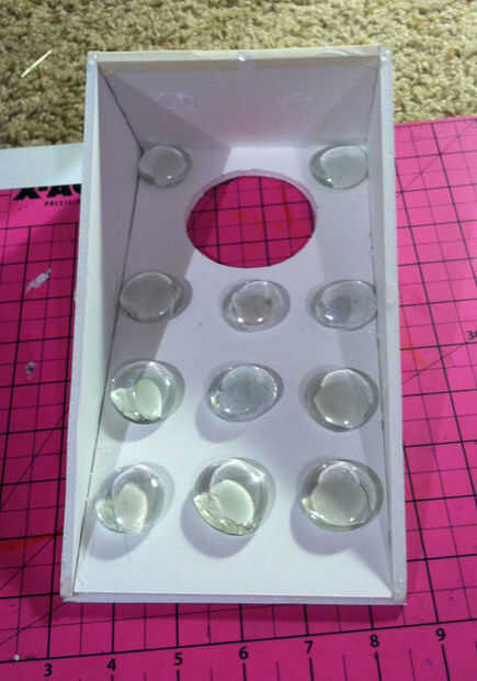 Porque la Junta tendrá que quedarse en un solo lugar incluso con bolsas de frijoles se arrojaron, usted tendrá que añadir alguna influencia que madera tiene pero carece de foamboard. La forma más sencilla de hacerlo es pegar por lo menos 6 canicas u otros pesos pequeños en la parte inferior del cartón pluma. (Tenía 8 canicas poner alrededor así que añadido un 2 extra para algunos más seguridad). El pegamento caliente es el mejor pegamento a usar para esta parte porque se "seca" muy rápidamente.
